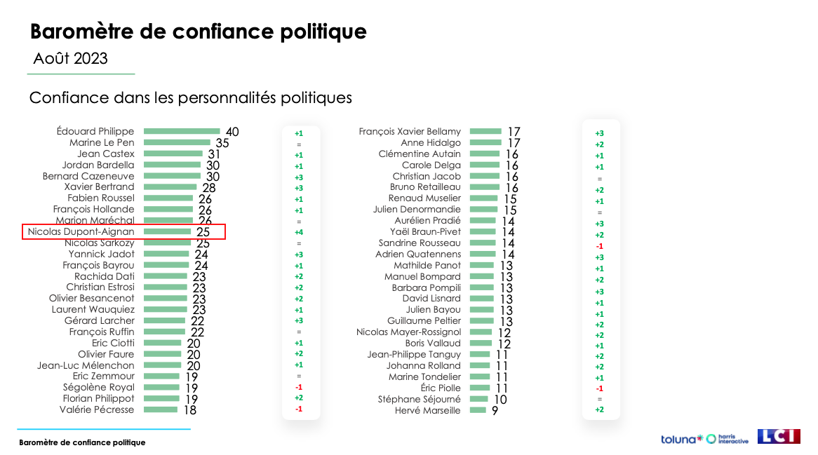 Dans le dernier baromètre de confiance politique d’Harris pour le mois d’août 2023, Nicolas DUPONT-AIGNAN marque la plus forte progression en gagnant 4 points, ce qui l’amène en 10ème position devant Laurent WAUQUIEZ (17ème position), Eric CIOTTI (20ème position) et Eric ZEMMOUR (23ème position) !
