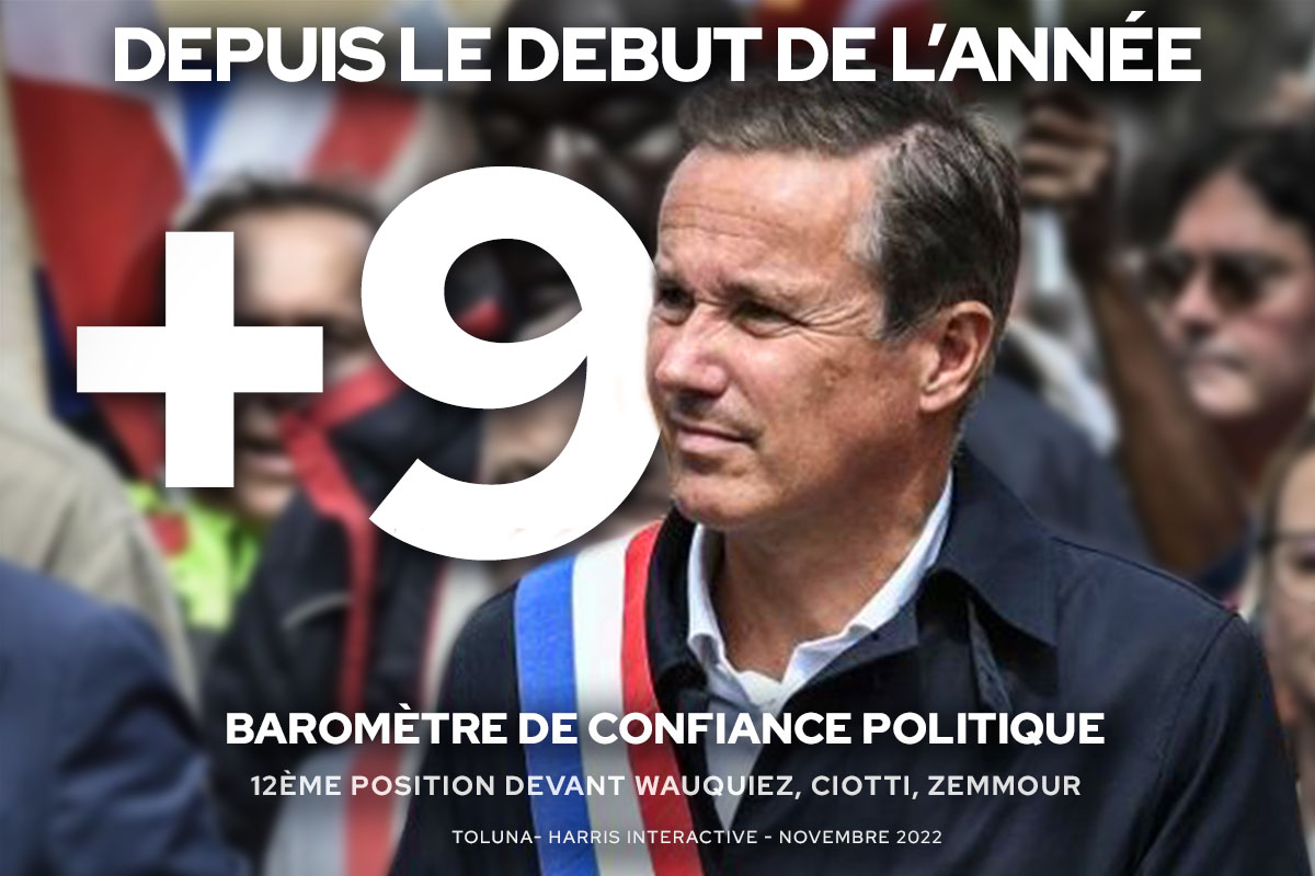 D’après le baromètre de confiance politique Toluna – Harris Interactive de Novembre 2022, la côte de confiance de Nicolas DUPONT-AIGNAN augmente de 9 points en 1 an.