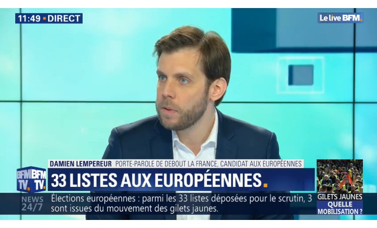 Retrouvez Damien Lempereur porte-parole de Debout la France et candidat sur la liste « Les Amoureux de la France » menée par Nicolas Dupont-Aignan aux élections européennes. Il était l’invité du live BFM ce samedi 4 mai 2019.