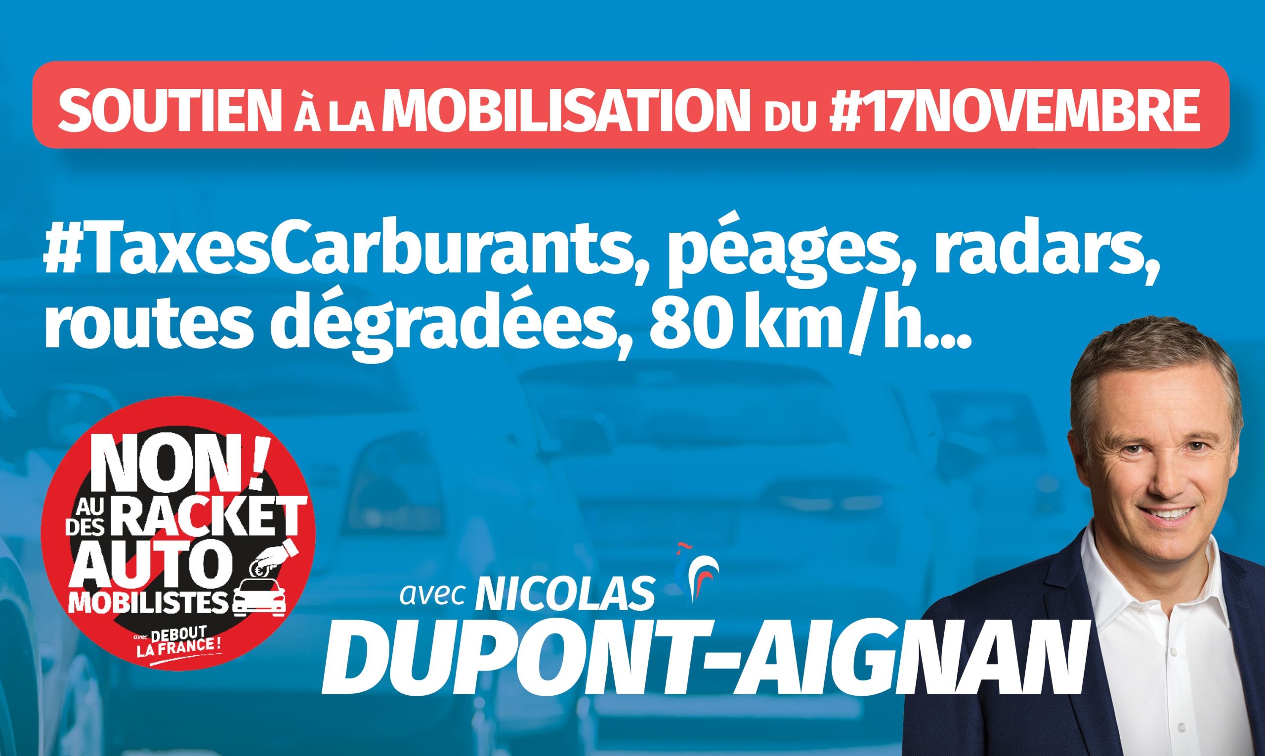 Dans la continuité de leur lutte de plus de 12 ans contre le racket des automobilistes et pour les initiatives populaires, Nicolas Dupont-Aignan et Debout La France soutiennent la mobilisation citoyenne du samedi 17 novembre organisée partout en France.