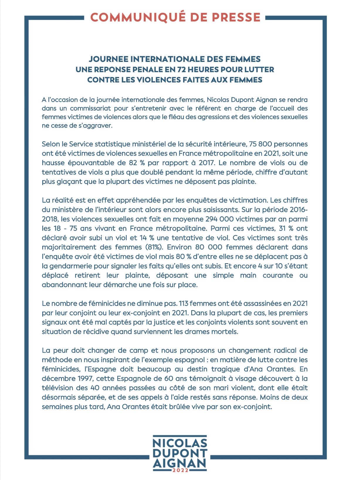 A l’occasion de la journée internationale des femmes, Nicolas Dupont Aignan se rendra dans un commissariat pour s’entretenir avec le référent en charge de l’accueil des femmes victimes de violences alors que le fléau des agressions et des violences sexuelles ne cesse de s’aggraver.