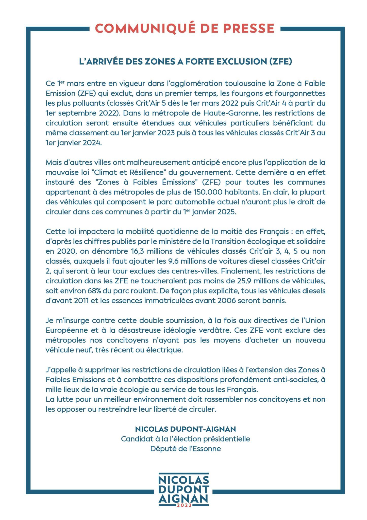 Nous appelons à supprimer les restrictions de circulation liées à l’extension des Zones à Faibles Emissions et à combattre ces dispositions profondément anti-sociales, à mille lieux de la vraie écologie au service de tous les Français.
