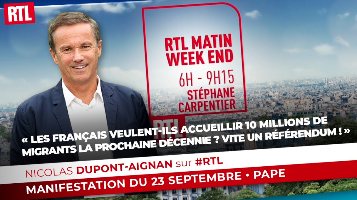 « Les Français veulent-ils accueillir 10 millions de migrants sur la prochaine décennie ? » · RTL, 24/09/23Vidéo24 septembre 2023Retrouvez l’intégralité de l’entretien de Nicolas DUPONT-AIGNAN ! Catégorie : VidéoPar Debout La France24 septembre 2023 Partager cet article Partager sur FacebookPartager sur Facebook Share on XPartager sur X Partager sur PinterestPartager sur Pinterest Partager sur LinkedInPartager sur LinkedIn Partager sur WhatsAppPartager sur WhatsApp Auteur : Debout La France https://debout-la-france.fr/ Précédent Article précédent :Les 10 points du projet européen pour une France libre au service d’un monde libre !SuivantArticle suivant :« Assez de drames ! Il faut un référendum sur l’immigration ! » · France Inter 23/09/23Articles liés« Macron est un danger public pour le pays ! » • Les Incorrectibles, 19/10/2519 octobre 2025« Seul un nouveau patriotisme peut sauver la France ! » · LCI, 19/10/2519 octobre 2025« Il y a un coup d’État européen, avec la complicité d’une classe politique minoritaire ! » · CNEWS, 12/10/2512 octobre 2025« Seule solution : la destitution ! » · LCI, 07/10/258 octobre 2025« Le gouvernement Lecornu est une provocation ! » · BFMTV, 05/10/257 octobre 2025« Ceux qui ont approché Macron sont en chute libre ! » · BFMTV, 30/09/20251 octobre 2025