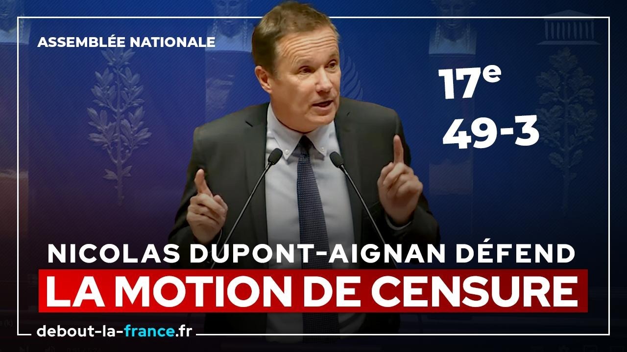 Motion de censure : discours de Nicolas Dupont-Aignan à l’AssembléeVidéo16 novembre 2023Retrouvez l’intégralité de l’intervention de Nicolas DUPONT-AIGNAN ! Catégorie : VidéoPar Debout La France16 novembre 2023Étiquettes : NL2 Partager cet article Partager sur FacebookPartager sur Facebook Share on XPartager sur X Partager sur PinterestPartager sur Pinterest Partager sur LinkedInPartager sur LinkedIn Partager sur WhatsAppPartager sur WhatsApp Auteur : Debout La France https://debout-la-france.fr/ Précédent Article précédent :« Notre oligarchie est fascinée par le modèle chinois !” · Livre Noir, 15/11/23SuivantArticle suivant :Européennes 2024 : Inauguration des nouveaux locaux de Debout la France !Articles liés« L’urgence : débrancher Macron et quitter l’Union européenne ! » · CNEWS, 02/12/252 décembre 2025« Ukraine : Les dirigeants de l’UE sont des nains de jardin » · BFMTV, 24/11/2525 novembre 2025« On a un fou à la tête de l’État ! » · RMC, 21/11/2521 novembre 2025« La France est abandonnée par ses dirigeants. Ne nous laissons plus faire ! » · TF1, 11/11/2511 novembre 2025« Macron est un danger public pour le pays ! » • Les Incorrectibles, 19/10/2519 octobre 2025« Seul un nouveau patriotisme peut sauver la France ! » · LCI, 19/10/2519 octobre 2025