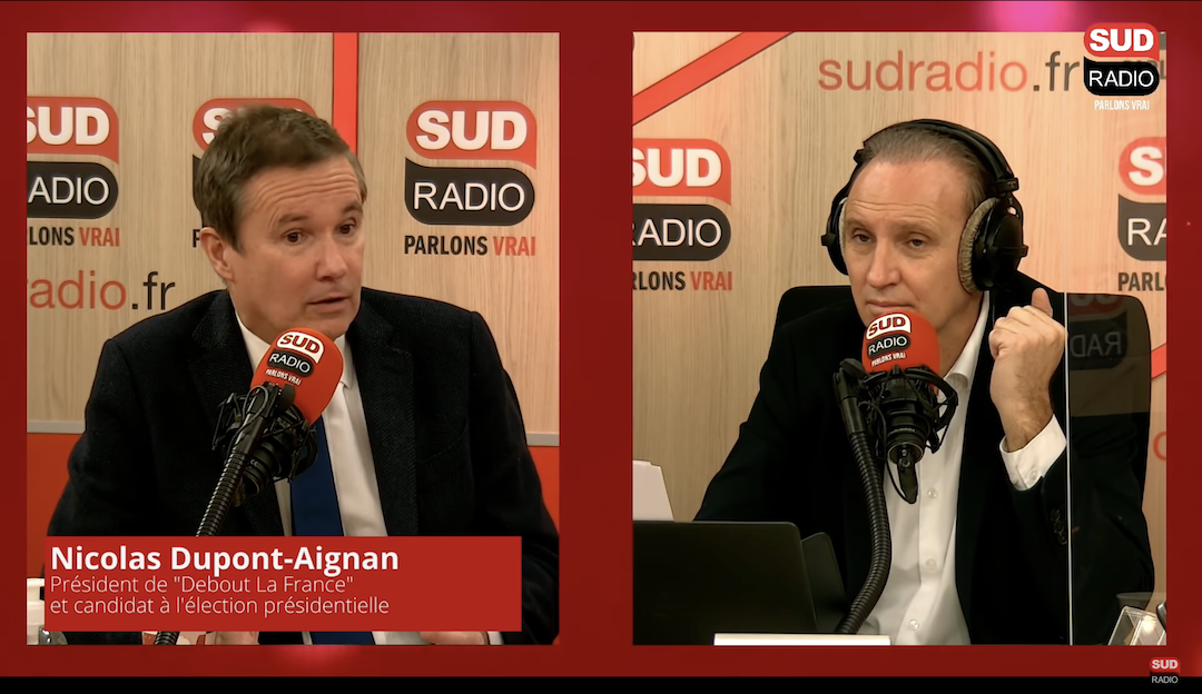 Nicolas Dupont-Aignan sur Sud Radio 31/01/2022Vidéo31 janvier 2022Retrouvez l’intervention de notre candidat Nicolas Dupont-Aignan sur Sud Radio. Catégorie : VidéoPar Nicolas Dupont-Aignan31 janvier 2022Étiquettes : NDA Partager cet article Partager sur FacebookPartager sur Facebook Share on XPartager sur X Partager sur PinterestPartager sur Pinterest Partager sur LinkedInPartager sur LinkedIn Partager sur WhatsAppPartager sur WhatsApp Auteur : Nicolas Dupont-Aignan Président de Debout la France Précédent Article précédent :Nicolas Dupont-Aignan sur LCI 29/01/2022SuivantArticle suivant :Nicolas Dupont-Aignan sur France Bleu Provence 01/02/2022Articles liés« L’urgence : débrancher Macron et quitter l’Union européenne ! » · CNEWS, 02/12/252 décembre 2025« Ukraine : Les dirigeants de l’UE sont des nains de jardin » · BFMTV, 24/11/2525 novembre 2025« On a un fou à la tête de l’État ! » · RMC, 21/11/2521 novembre 2025« La France est abandonnée par ses dirigeants. Ne nous laissons plus faire ! » · TF1, 11/11/2511 novembre 2025« Macron est un danger public pour le pays ! » • Les Incorrectibles, 19/10/2519 octobre 2025« Seul un nouveau patriotisme peut sauver la France ! » · LCI, 19/10/2519 octobre 2025