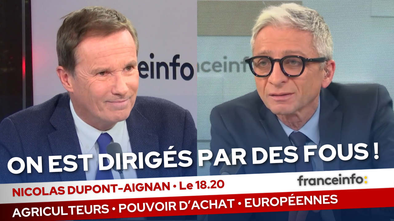 « On est dirigés par des fous ! » • France Info, 23/01/24Vidéo23 janvier 2024Retrouvez l’intégralité de l’entretien de Nicolas DUPONT-AIGNAN ! Catégorie : VidéoPar Debout La France23 janvier 2024Étiquettes : NL3 Partager cet article Partager sur FacebookPartager sur Facebook Share on XPartager sur X Partager sur PinterestPartager sur Pinterest Partager sur LinkedInPartager sur LinkedIn Partager sur WhatsAppPartager sur WhatsApp Auteur : Debout La France https://debout-la-france.fr/ Précédent Article précédent :« L’UE tue nos agriculteurs ! » · Public Sénat, 23/01/24SuivantArticle suivant :N’importons pas ce que l’on interdit en France !Articles liés« L’urgence : débrancher Macron et quitter l’Union européenne ! » · CNEWS, 02/12/252 décembre 2025« Ukraine : Les dirigeants de l’UE sont des nains de jardin » · BFMTV, 24/11/2525 novembre 2025« On a un fou à la tête de l’État ! » · RMC, 21/11/2521 novembre 2025« La France est abandonnée par ses dirigeants. Ne nous laissons plus faire ! » · TF1, 11/11/2511 novembre 2025« Macron est un danger public pour le pays ! » • Les Incorrectibles, 19/10/2519 octobre 2025« Seul un nouveau patriotisme peut sauver la France ! » · LCI, 19/10/2519 octobre 2025
