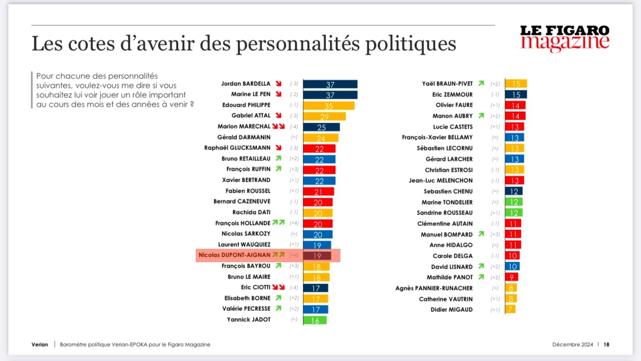 Nicolas Dupont-Aignan enregistre la plus forte hausse de popularité parmi toutes les personnalités politiques alors que beaucoup baissent ! Parmi les personnalités de droite d’opposition, il est le seul àaugmenter (+4) quand Marine LE PEN, Jordan BARDELLA, Marion MARÉCHAL, Eric CIOTTI et Éric ZEMMOUR baissent.