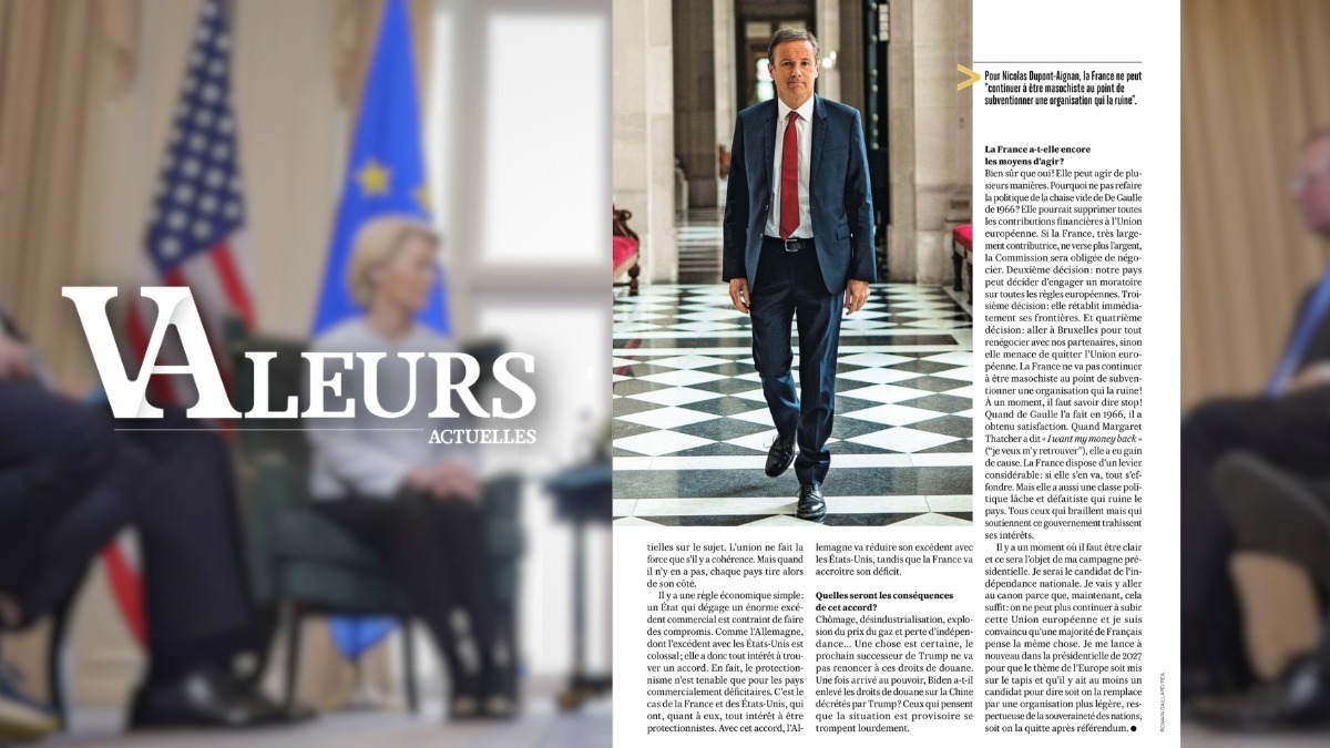 « Se faire ainsi racketter par les États-Unis est inacceptable » • Valeurs Actuelles, 06/08/25Actualités13 août 2025Retrouvez l’intégralité de l’entretien de Nicolas DUPONT-AIGNAN ! Catégorie : ActualitésPar Debout La France13 août 2025Étiquettes : NL03 Partager cet article Partager sur FacebookPartager sur Facebook Share on XPartager sur X Partager sur PinterestPartager sur Pinterest Partager sur LinkedInPartager sur LinkedIn Partager sur WhatsAppPartager sur WhatsApp Auteur : Debout La France https://debout-la-france.fr/ Précédent Article précédent :LES FRANÇAIS DE L’ÉTRANGERSuivantArticle suivant :« Souveraineté, liberté, paix : décryptons ensemble les enjeux cruciaux de 2027 ! » • Radio Courtoisie, 17/08/25Articles liésObligation vaccin grippe ou comment tuer notre système de santé25 novembre 2025La fin de nos opérateurs mobiles français pour des services américains ?23 novembre 2025Semaine européenne pour l’emploi des personnes handicapées (SEEPH).17 novembre 2025Victor Wembanyama, “l’Alien” : le Français qui fait trembler la NBA16 novembre 2025Très forte mobilisation pour la journée d’hommage au Général de Gaulle !10 novembre 2025Nicolas Dupont-Aignan au Salon du Made In France 20258 novembre 2025