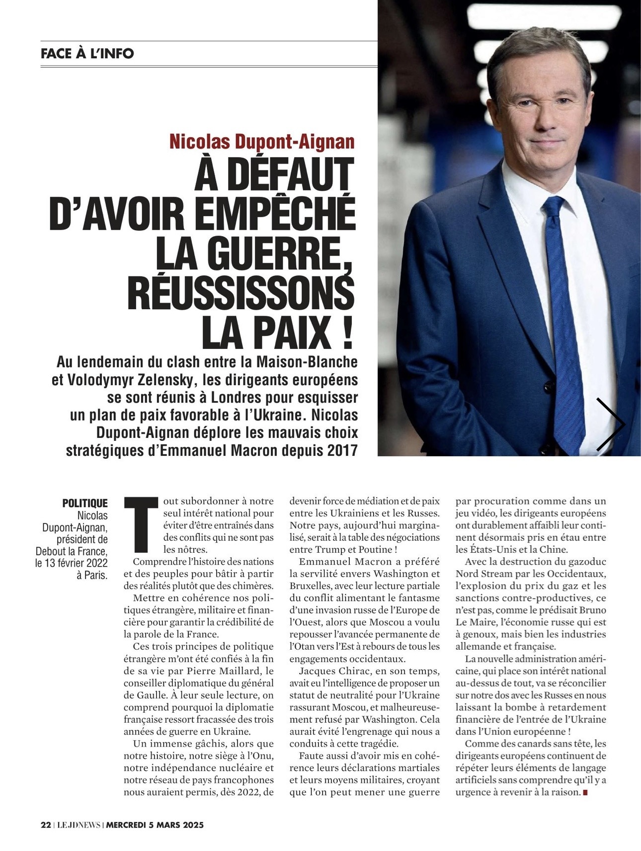 Retrouvez la tribune de Nicolas DUPONT-AIGNAN sur la guerre en Ukraine parue dans le JDNews du 05/03/25.