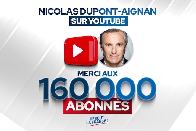 La chaîne YouTube de Nicolas Dupont-Aignan vient d’atteindre les 160 000 abonnés, 160 000 mercis ! Pour ne rater aucune vidéo, vous aussi, abonnez-vous ! C’est gratuit et avec un…