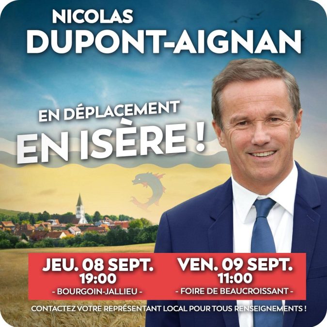 Nicolas DUPONT-AIGNAN sera en déplacement en Isère jeudi 8 et vendredi 9 septembre. Il ira à votre rencontre autour de 2 rendez-vous : Le jeudi 8 Septembre à partir de 19h00 à La…