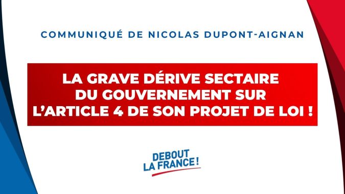 COMMUNIQUÉ DE NICOLAS DUPONT-AIGNAN LA GRAVE DÉRIVE SECTAIRE DU GOUVERNEMENT SUR L’ARTICLE 4 DE SON PROJET DE LOI ! Hier, l’Assemblée Nationale comme le Sénat, a supprimé l’article 4 du…