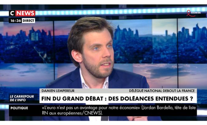 Retrouvez les interventions de Damien Lempereur porte-parole de Debout la France invité du débat du « Carrefour de l’info » sur CNews ce dimanche 31 mars 2019.