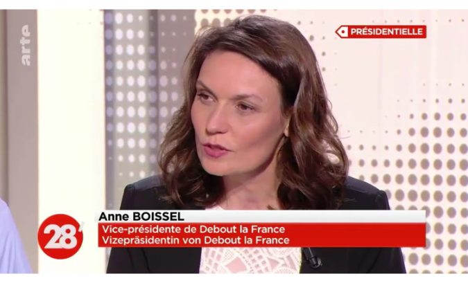 Le jeudi 6 avril 2017, Anne boissel Vice-Présidente de Debout la France et porte parole de Nicolas Dupont-Aignan était l’invitée du débat du 28′ sur Arte