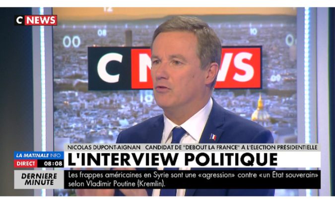 Le vendredi 7 avril 2017, Nicolas Dupont-Aignan, Président de Debout la France et candidat à l’élection présidentielle était l’invité de Jean-Pierre Elkabbach sur C News