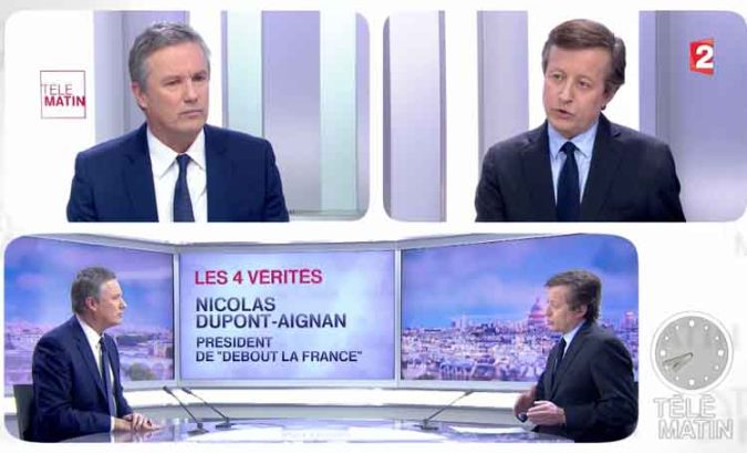 Le lundi 8 février 2016, Nicolas Dupont-Aignan Président de Debout la France était l’invité de Roland Sicard dans les 4 Vérités sur France 2