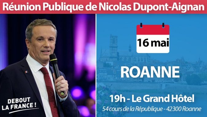 Dans le cadre de son tour de France, Nicolas Dupont-Aignan vous attend nombreux à Roanne le 16 mai prochain ! Cette réunion publique, ouverte à tous, se tiendra au Grand…