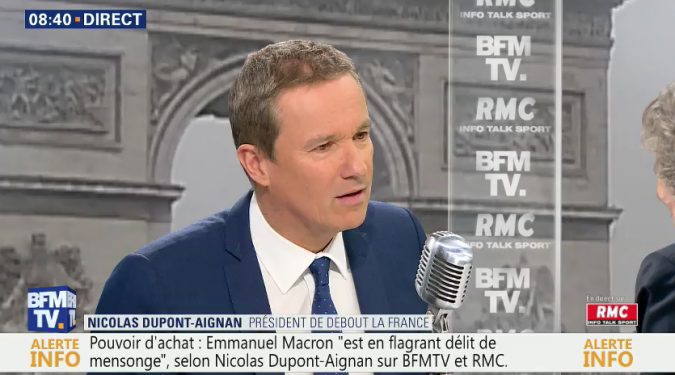 Le mercredi 14 février 2018, Nicolas Dupont-Aignan député de l’Essonne et président de Debout la France était l’invité de Bourdin Direct sur RMC / BFMTV