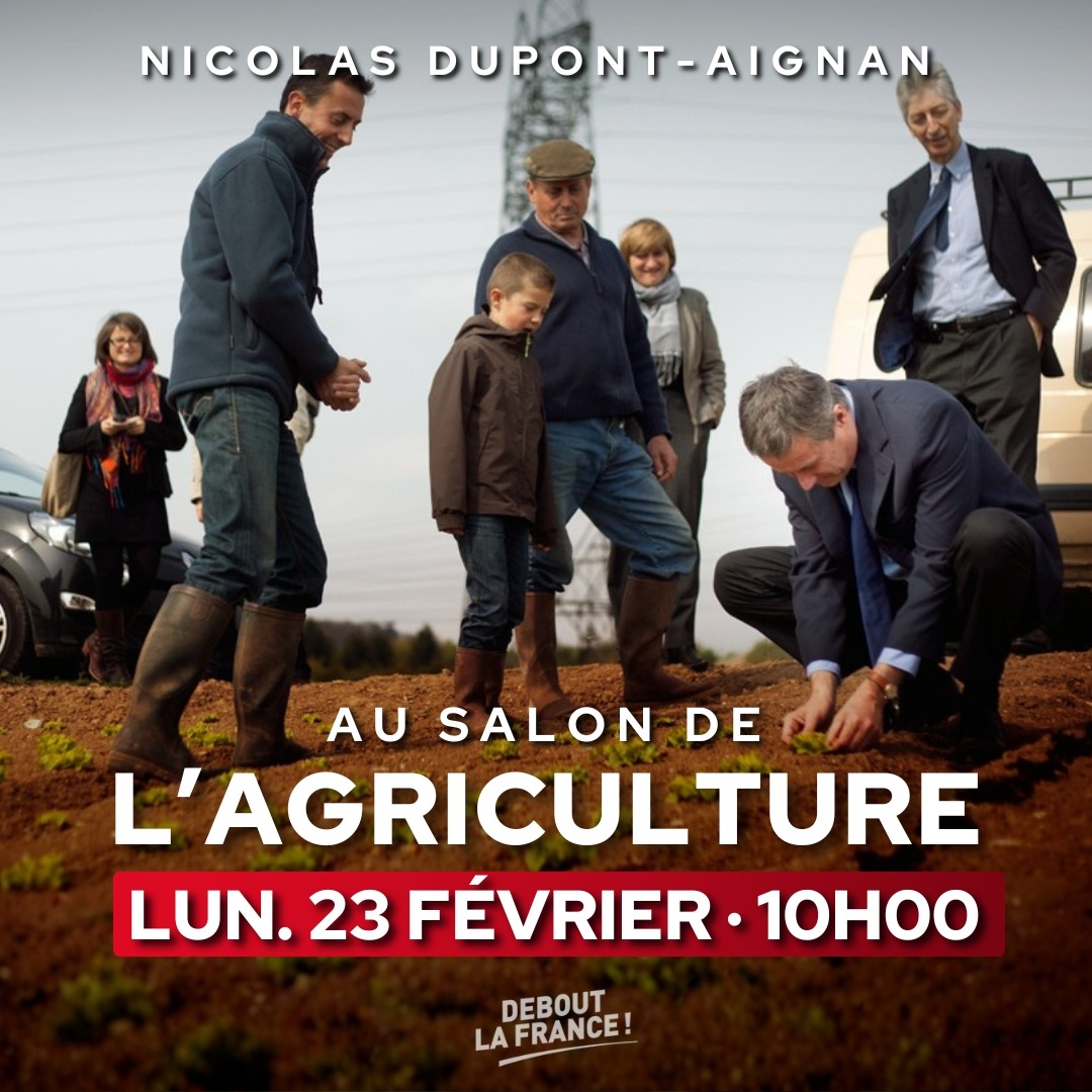 Nicolas Dupont-Aignan sera présent au Salon de l’Agriculture le lundi 23 février à partir de 10h, accompagné d’une délégation d’agriculteurs et de maires ruraux.