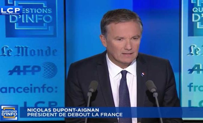 Le mercredi 12 octobre 2016, Nicolas Dupont-Aignan, président de Debout la France et candidat à l’élection présidentielle de 2017 était l’invité du débat de « Questions D’info » sur LCP