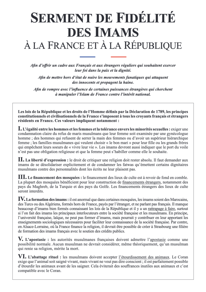 - Conditionner l’ouverture d’une mosquée à la signature du Serment de fidélité à la République Française par l’imam et le président de l’association cultuelle.